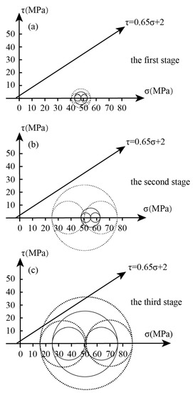 After the first stage, the Mohr stress circle expands outward from the center of the circle. At this time, the Mohr stress circle is far from the failure envelope and no fractures are formed in the reservoir (Figure 9a). After the second stage, the center of the Mohr stress circle moves to the left and the diameter of the Mohr circle increases significantly. At this time, the distance between the Mohr circle and the failure envelope line is small (Figure 9b). After the third stage, the center of the Mohr stress circle continues to move to the left and, at the same time, its diameter further increases, and the Mohr stress circle intersects with the failure envelope. At this time, some rocks near the fracturing point suffered shear damage (Figure 9c).