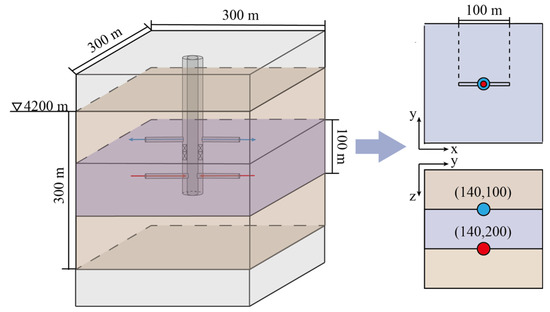 The Dirichlet boundary conditions are applied to the injection well. Meanwhile, the frictional pressure loss along the wellbore is ignored, which can effectively conduct the wellhead high pressure to the fracturing point. The zero heat and mass flow boundary conditions are applied to the bottom boundary of the model, and the rest of the boundaries are constant temperature and constant pressure boundaries. To monitor the change of the stress field of the model in real-time, the displacements in the x and y directions of the top, bottom, and surrounding boundaries of the model, and the z-direction displacement of the bottom boundary, are limited.