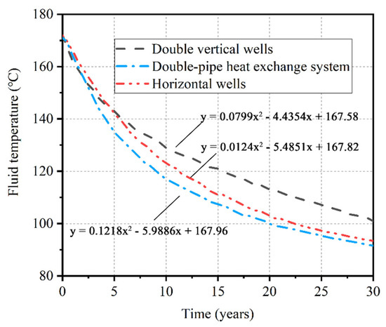 The simulation results based on the heat exploitation model are shown in Figure 12, Figure 13 and Figure 14; to further compare the heat extraction capabilities of different systems, the trend line equations in polynomial form were also included in the figure. Under the same reservoir condition, Figure 12 shows the temperature of a production well under different production models over 30 years. It can be observed that the average production temperature of the three exploitation models decreases gradually with time. After 30 years, the temperature of a production well in the conventional double vertical wells model, horizontal wells, and double-pipe heat exchange system is 101 °C, 93.4 °C, and 91.6 °C, a decrease of 41.2%, 45.7%, and 46.7%, respectively. In the process of geothermal energy exploitation, the outlet temperature of the double-pipe heat exchange system is always lower than the horizontal wells. After 2 years of exploitation, the outlet temperature of the conventional double vertical wells model is higher than the double-pipe heat exchange system and exceeds the horizontal well in the fifth year.