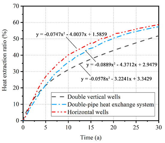 As shown in Figure 14, after 30 years of geothermal energy exploitation, the heat extraction ratio of the double-pipe heat exchange system is always lower than the horizontal wells. In the early stage of geothermal energy exploitation, the heat transfer efficiency of the conventional double vertical wells is higher, but as the exploitation progresses, it is gradually lower than that of the horizontal wells and the double-pipe heat exchange system. Additionally, in the 30th year of heat exploitation, the heat extraction ratio of the horizontal wells is 2% higher than the double-pipe heat exchange system and 6.5% higher than the conventional double vertical wells.