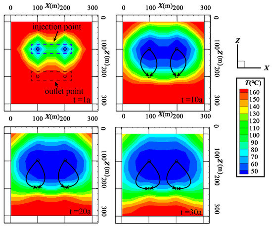 The temperature field distribution under different exploitation models is shown in Figure 15, Figure 16 and Figure 17. In the early stage of geothermal energy exploitation, the conventional double vertical wells are centered on the injection point, the low-temperature area is approximately concentric circles, and the range of the low-temperature area is small and does not extend to the vicinity of the production well. Therefore, compared with other production models, the heat extraction rate of the double vertical wells system is higher at this stage. With the development of geothermal energy exploitation, the fluid medium flows continuously to the outlet point through the fracture network, the low-temperature area expanded to the outlet point. In the 20th year, the low-temperature area was extended to the water outlet point, the low-temperature area is in the shape of a droplet, and at this stage, the production efficiency of geothermal wells decreased significantly. In the 30th year, the low-temperature area spreads more below than above the water outlet. It is speculated that the reason for this phenomenon is that the fluid medium will flow downward due to the action of gravity. At the same time, compared with other production modes, the conventional double vertical production mode has only one water outlet. This will lead to untimely water output from the outlet point, and the sedimentary fluid medium continuously exchanges heat with the reservoir, which is also the reason why the water temperature and thermal power output of the double vertical wells are higher than in other heat extraction systems.
