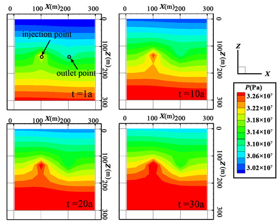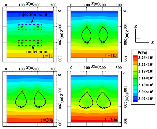 The pressure field distribution under different exploitation models is shown in Figure 18, Figure 19 and Figure 20. As shown in Figure 18, in the early stage of geothermal energy exploitation, it can be observed that the pressure around the injection point is the highest, while the pressure around the outlet point is the lowest. This is because the conventional double vertical wells use single-point water injection and single-point pumping. Compared with other heat transfer modes, the seepage path of the fluid medium in the fracture network is longer and the loss of wellhead pressure is larger. In this stage, the low-temperature area did not extend to the vicinity of the outlet point; as the water injection continues, the pores and fractures in the reservoir are filled with a fluid medium, and the reservoir pressure gradually increases with time. After 20 years of exploitation, the injection pressure increases and the production pressure decreases. In this stage, the low-temperature area extends to the vicinity of the outlet point. As the temperature of the reservoir decreases, the viscosity of the fluid medium increases, which leads to the wellhead pressure lost during the flow of the fluid increases, and the pressure difference between the water injection point and the outlet point increases.