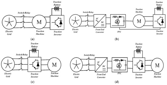 Integrated chargers can be classified as machine-integrated or converter-integrated. Machine-integrated chargers have the charging power injected into the machine windings that are utilizing them as the filter inductors. They can be either single stage or dual stage, as is depicted in Figure 3a, b. Converter integrated chargers are the ones where the charging current/power is injected through the traction converter and machine windings are left untouched. These types can also be classified into single stage or dual stage architectures. Figure 3 below depicts the different configurations of machine-integrated chargers.