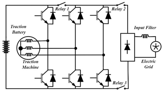 In the single stage architecture, the electric grid is connected to the traction inverter via machine windings that act as an input filter; thus, no extra bulky filter is needed for the charger. The traction inverter acts as the AC to DC converter, and output is directly connected to the traction battery. In the two-stage architecture, an AC–DC rectifier is connected with the grid, and the power factor correction circuit is implemented first before the DC link is connected to the traction inverter, which essentially acts as a DC–DC converter during charging. During traction, a grid-side relay is opened, and the traction machine is powered via a traction inverter by the traction battery.