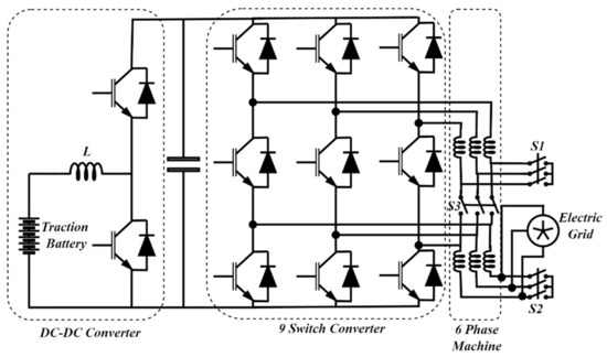 Three-phase machines in the integrated chargers tend to rotate during charging mode due to the developed torque, so they require either mechanical braking during charging, which makes them less efficient and wear-and-tear prone, or require complex control algorithms in order to have the resultant torque as zero. Six-phase machines, on the other hand, require no such mechanism. Two different sets of three phases can cancel out the torque produced during charging by the simple arrangement of windings. The authors in [71] proposed an integrated charger topology using a six-phase machine. It required a nine-switch-converter (NSC) to control the six-phase machine. The NSC has the advantage over two different conventional converters to supply and control the two different sets of three-phase voltages, as it only needs nine switches instead of twelve. It can also supply two different loads by controlling the switching frequency of the upper switches and lower switches differently. At the battery side, there is a boost converter. During the charging, the NSC acts as the conventional PWM converter, and the machine windings are utilized as the filter inductors. It can be noticed from Figure 6 that the sequence of the lower windings is reversed; this is to make sure that the total torque produced due to the battery charging current is zero. During traction operation, relay S3 is open, while S1 and S2 are closed. This disconnects the converter from the grid, and the NSC works as a drive inverter for the six-phase machine. The control algorithm is simple and can be applied without any complications. However, this system requires a specially modified six-phase machine, which can be costly.