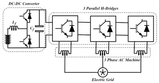In [72], the authors introduced a winding-midpoint current injection technique for charging an EV battery, as is shown in Figure 7. This is done to cancel out any torque produced due to the charging current. The topology utilizes three h-bridge converters, which also work as a boost PFC and a DC–DC buck/boost converter at the battery side. During charging, the three h-bridges act as active rectifiers, and machine windings are used as filter inductors. A current controller makes sure that the flux produced in each winding cancels each other, so there is no resultant torque during the charging mode. During traction mode, the three h-bridge converters act as single-phase drives for each winding. The topology requires access to the midpoints of the stator windings, which requires a specially designed machine for this charger. Moreover, the use of three h-bridges increases the number of switches, which means increased losses and decreased reliability of the integrated charger.