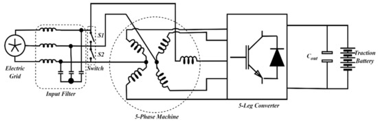 Similar to [71,73] also exploits the benefit of multi-phase machines for integrated charger operation, since they have an extra degree of control, which allows precise flux control in the traction machine during charging to produce zero torque. The authors presented the scheme for a five-phase machine, but it can be extended to any prime number of phases with at least one neutral point. For the proposed scheme, only two extra switches are needed apart from the traction drive, as is shown in Figure 8. During charging mode, the extra switches S1 and S2 are open, and the three-phase input is connected to the two neutral points and a phase outlet of the machine. The machine windings are utilized as filter inductors. The PFC operation is performed by a five-phase converter, which is used as a traction inverter during traction mode. A bidirectional DC–DC converter is required at the battery side if the battery voltage is lower than the grid voltage. During charging, a pulsating field is produced, due to the odd number of phases. This pulsating field is not enough to generate the starting torque of the machine. Current flowing in the five windings causes core losses in the machine and reduces the efficiency of the system. Moreover, to access the midpoints of the windings of the machine, a specially constructed machine is required.