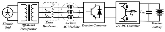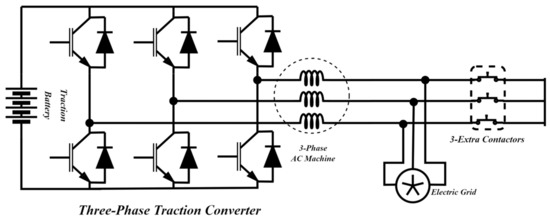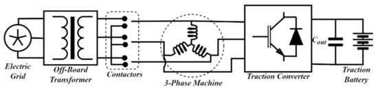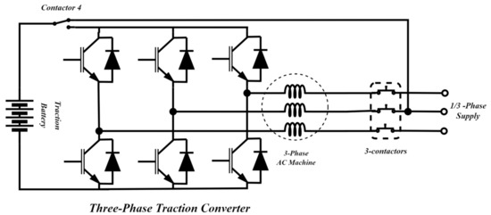 A fast charger for level 2 charging was proposed in [74], as is shown in Figure 9. A surface mount permanent magnet (SPM) machine is used in this integrated charger. An off-board, three-phase transformer is used to isolate the grid from the charger. An additional contactor is used for the three phases. The secondary side of the transformer is connected to the three phases of the motor windings. During charging, the contactor connects the motor winding to the grid, and the windings act as an input filter. Power factor correction is done with a control strategy by controlling the duty cycle of the traction converter. During traction, the contactor connects the motor windings in star connection, and the traction inverter provides the required power. The proposed system supports up to 30 kW of charging with a maximum efficiency of 97%. The motor produces around 70 Newton meters of torque during charging when 80 A of charging current flows through the motor windings. This torque is not enough to rotate the machine, but some vibrations are produced. Thus, the system is prone to wear-and-tear. Moreover, if the system is to work in bidirectional mode, an additional DC–DC converter is required at the battery side in case the DC link voltage is lower than the peak line-to-line grid voltage.