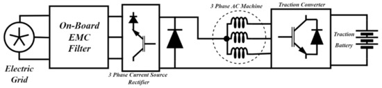 Renault proposed an integrated charging scheme where the motor windings were utilized as an input filter, as is shown in Figure 11. The charger can be used for fast charging, as well as for level 1 or 2 charging [76]. The input rectifier stage was controllable, as unidirectional IGBTs were connected in series with the rectifying diodes. The duty cycle of the IGBTs governs the output current. The PFC operation can be performed either by the three-phase inverter stage or even by the input rectifier stage. A constant current–constant voltage (CC–CV) charging scheme is utilized, due to its simplicity and effectiveness. The rectified input current is connected to the neutral point of the star-connected motor windings. Therefore, the motor needs to be especially constructed according to the needs of the charger to provide access to the neutral point of the windings.