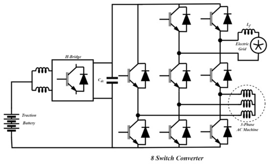 The authors in [59] modified the traction inverter by adding two more switches, as is shown in Figure 13. The new topology can perform bidirectional, single-phase AC–DC operation, along with the traditional three-phase, bidirectional AC–DC operation. An interleaved DC–DC converter is also used at the battery end to control the DC link voltage for traction. It can act as a forward buck or reverse boost converter, depending on whether it is used for charging or traction. The proposed converter can also supply power back to the grid (V2G) by controlling the eight-switch converter as a single-phase DC to AC converter. The PFC operation is maintained using a control algorithm. Since motor windings are not used for the charging operation, there is no risk of torque production in the motor during charging. Also, no special construction for the traction machine is required. However, there is no galvanic isolation, and the added DC–DC converter, along with the two inductors, increases the charger weight and volume.