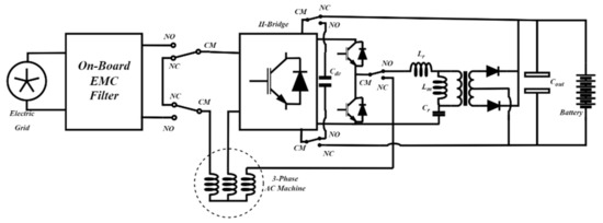 The second type of OBCs are the integrated OBCs. Given that charging and traction are two mutually exclusive events and the semiconductor devices utilized for both traction and charging can be similar, in order to reduce the cost and improve the performance of the charging structure, integrated chargers were introduced. They make use of the motor windings as the input filters and the traction inverter as the power factor correction converter during charging [39,40,41].