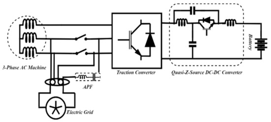 One of the major problems for any OBC is the existence of a low frequency ripple at the rectifier side which is then passed on to the battery through a charging current if a bulky DC link capacitor is not employed. One of the solutions is to utilize an auxiliary power filter (APF) circuit to absorb the lower frequency power, as is presented in [81]. The authors have utilized the motor windings as the input buffer filter during charging with an extra APF circuit to absorb the double line frequency power ripple. The traction inverter is utilized for PFC operation. A quasi-z-source DC–DC converter is utilized at the battery end to minimize the losses and control the power to and from the battery. The introduction of the extra APF adds to the cost, weight, and size of the charger. Figure 18 below depicts the circuit configuration.