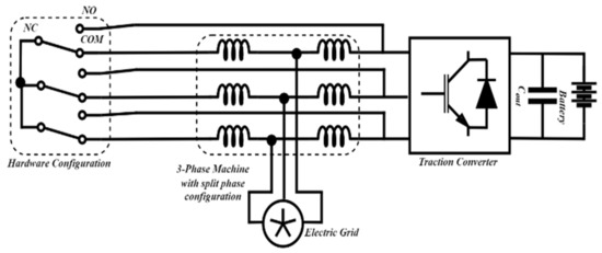 One of the main problems of using the motor windings for charging is the developed stray torque. The authors of [82] used a split-phase motor design approach to avoid the development of torque during charging. During the charging operation, the three phase windings are split so that equal and opposite currents flow in all the phase windings, which leads to zero torque generation, as is shown in Figure 19. During traction, the windings are connected in series and they act as the normal three-phase machine driven by the traction converter. Construction of a split phase motor is the major issue for this topology, as it will require a specially constructed machine, which would increase the cost and effort. Moreover, the iron and core losses will also increase in the machine leading to add additional loss in efficiency. The charger is suitable for level 2 and level 1 charging and can also accommodate bidirectional power flow; thus, V2G is also supported. To provide extra protection, the authors advised using the external transformer for isolation.