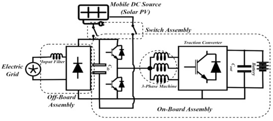 An on-board integrated DC charger was proposed in [83]. The charger enables charging operation even during traction mode, which is suitable for vehicles with mobile charging sources, like solar PVs. The charger also provides fault protection. The charger can work in both buck and boost mode in both directions. However, it can only work with DC inputs. The front-end DC–DC converter is connected to the neutral of the three-phase winding during charging and injects the DC current, as is shown in Figure 20. Since the current responsible for torque generation is the iq current (q-axis charging current component), and the DC and iq currents are totally unrelated, there is no chance of torque generation during charging. The main limitation of the charger is that it only operates with DC supplies; thus, an off-board arrangement for AC to DC conversion is required if there is no solar PV. Thus, that would limit vehicle charging options, including at night time when there’s no sunlight.