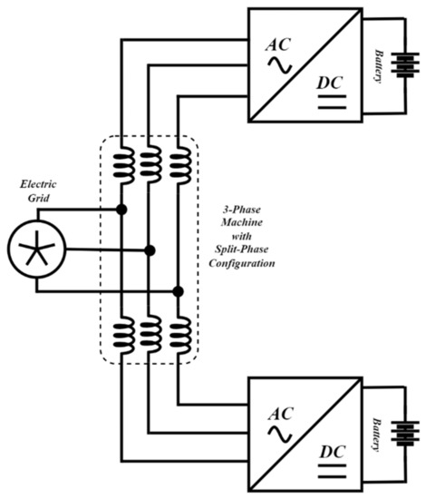 In order to have zero torque during charging, a split-phase three-phase machine was proposed in [84]. The three phase windings of the machines are split into two equal parts, and the utility grid is connected to their mid-points, as is shown in Figure 21. This approach makes sure that the torque produced by one half-phase cancels out the torque produced by another half-phase. A dual inverter approach is considered in order to provide a path for the zero-sequence current. A modified new modulation strategy was also discussed, which minimizes the common-mode current during charging. The main limitation of the topology is that it requires special construction of the machine for splitting the phase-windings. Moreover, utilizing the dual inverter increases the cost and reduces the power density of the charger.
