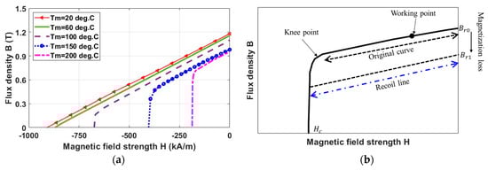 - Zhou, P.; Lin, D.; Xiao, Y.; Lambert, N.; Rahman, M. Temperature-dependent demagnetization model of permanent magnets for finite element analysis. IEEE Trans. Magn. 2012, 48, 1031–1034. [Google Scholar] [CrossRef]