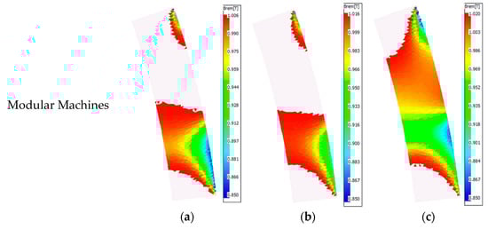 Remanence distribution of the PM obtained using the coupled EM-thermal model of Motor-CAD for (a) condition 1, Tm′ = 160 °C; (b) condition 2, Tm′ = 153 °C; (c) condition 3, Tm′ = 150 °C; (d) condition 1, Tm′ = 158 °C; (e) condition 2, Tm′ = 148 °C; and (f) condition 3, Tm′ = 140 °C.