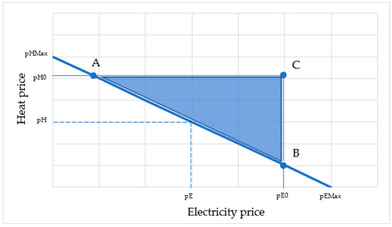 If pE0 and pH0 are the average electricity and heat prices existing in the energy markets, it is easy to find the area where the pairs of pE and pH values can be positioned, respectively, above the balance line in the area delimited by points A, B, and C.