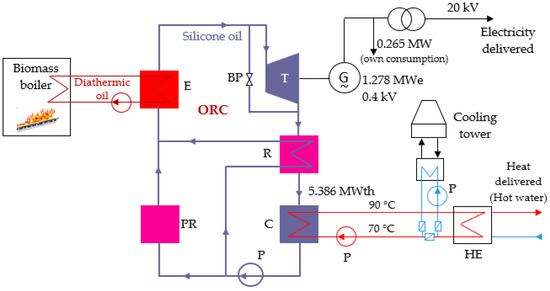 A power cogeneration plant (1.287 MWe; 5.386 MWth) based on ORC technology and biomass fuel is used in the case study (