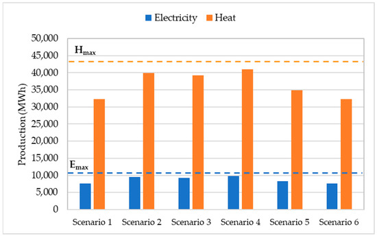 Figure 8 shows the minimum quantities of heat and electricity that balance the operating costs (including the desired profit) under the new conditions of increasing the price of the purchased fuel. It can be easily seen that the CHP plant has a reserve of production growth between 7% and 27% (7% in Scenario 4; 27% in Scenario 1 and Scenario 6) which can maximize annual receipts and implicitly increase profit.