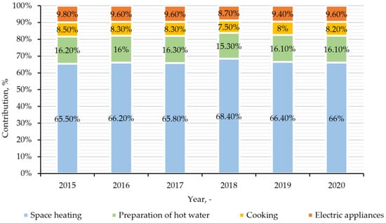 The total primary energy consumption in Poland in 2010–2020 increased from 100.5 Mtoe to 101.8 Mtoe, of which the share of energy consumption in households in 2020 was 25.6% [,]. It is estimated that economic activity, which increased energy demand by 13.7 Mtoe in 2020 compared to 2010, had the greatest impact on the change in energy consumption in the residential sector. In Poland, as in Canada, the second place in the structure of energy consumption in the residential sector is held by the preparation of domestic hot water. This tendency has not changed since 2015 (Figure 1) [].