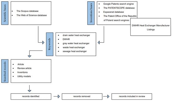 The search for literature sources was based on the Scopus and Web of Science databases, while the selection of inventions was based on the analysis of data from international patent databases. Initial verification of the eligibility of scientific manuscripts and technical solutions on the subject of heat recovery from grey water was carried out on the basis of keywords. The scheme of searching for literature sources and inventions is shown in Figure 2.
