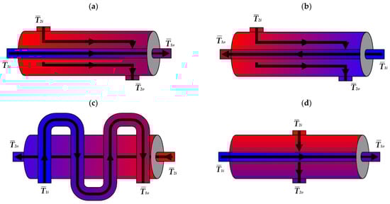 Heat exchanger fluid flow classification: (a) co-current flow, (b) countercurrent flow, (c) hybrid flow, (d) crossflow; —temperature of the first medium at the inlet to the heat exchanger,  —temperature of the first medium at the outlet of the heat exchanger,  —temperature of the second medium at the inlet to the heat exchanger,  —temperature of the second medium at the outlet of the heat exchanger [,,].