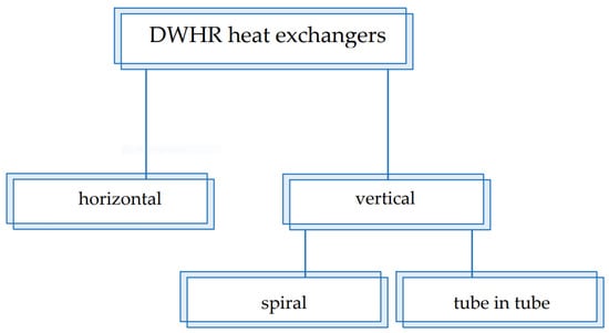 In the case of the sanitary installation, the design solution that does not include the separation of the system into drainage pipes for grey water and black water, drain water heat recovery (DWHR) exchangers can be used to preheat water at sanitary facilities. DWHR heat exchangers are the most commonly used in residential construction [,,,]. The division of this type of device is shown in Figure 4.