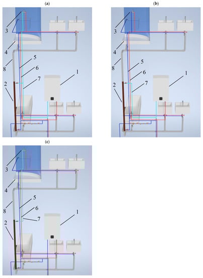 Examples of installation of a vertical heat exchanger: (a) Variant I—installation with DWHR heat exchanger and preheated water flowing to the water heater and shower mixing valve, (b) Variant II—installation with DWHR heat exchanger and preheated water flowing to the water heater, (c) Variant III—installation with DWHR heat exchanger and preheated water flowing to the shower mixing valve; 1—water heater, 2—DWHR heat exchanger, 3—shower mixing valve, 4—shower stall, 5—cold water pipe, 6—hot water pipe, 7—preheated water pipe, 8—waste stack.