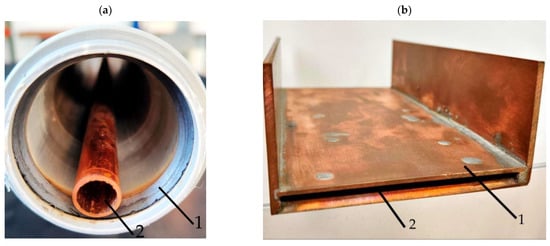 Heat exchangers used in waste water systems and domestic hot water preparation are devices in which the general design is based on the use of two drains with a circular (Figure 6a) and/or rectangular (Figure 6b) section. One of the drains is used to discharge sewage from sanitary facilities to the sewage system. The second drain is used to supply cold water to the domestic hot water system. The heat exchangers described in the references differ mainly in the size and method of running the cold water drain in relation to the waste water outflow. There are also studies that have focused on developing inexpensive heat exchanger solutions [,]. In the group of vertical exchangers, there are devices installed directly in the linear drainage of a shower. Examples of horizontal heat exchanger solutions described in the literature or patent sources are summarized in Table 1.