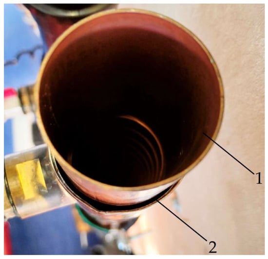 Among the vertical exchangers, there are tube-in-tube units. The basic element of their construction is the grey water drain. Tap water is supplied to this type of device, which flows in countercurrent through the space created between the inner drain (waste water pipe) and the pipe constituting its outer casing. In this type of solution, the flowing grey water does not fill the entire cross-section of the conduit, but flows down its walls, creating a thin layer called film. In some solutions, elements are used to slow down the flow of wastewater [], which serves to increase the heat exchange surface, in turn achieving a significant shortening of the required length of the exchanger without reducing its efficiency. A typical cross-sectional view of a vertical tube-in-tube heat exchanger is shown in Figure 7.