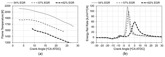 (a) Flame temperature and (b) energy release rate during a minor change in the EGR rate at a fixed SOI of −21 °CA ATDC. Note different x-axis scales to focus on the flame temperature (a) and provide the full combustion profile (b).