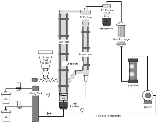 Figure 1 shows a schematic stream of the test facility of the 30 kW CFB oxy-fuel reactor. The demonstration test was conducted in the facility, which consisted of a riser, a cyclone, a down-comer, and a loop-seal. The facility had a riser with an inner diameter of 0.15 m and a height of 6.4 m. The combustion temperature for the sludge fuel combustion was optimized at 800 °C. The feeding rate of the sludge was determined at 13 kg/h. Table 1 shows the summary of experimental conditions using the 30 kW CFB oxy-fuel reactor [16].