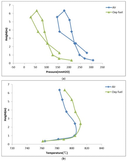 The pressure and temperature profile from air and oxy-fuel combustion of waste sewage sludge: (a) pressure profile (b) temperature profile.