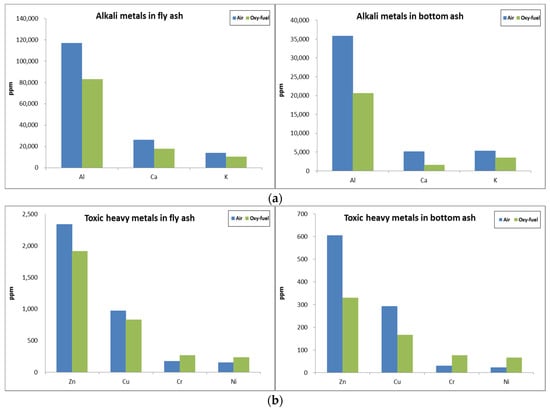 Concentrations of alkali and heavy metals in bottom and fly ash from air and oxy-fuel waste sewage sludge combustion: (a) alkali metals (b) heavy metals.