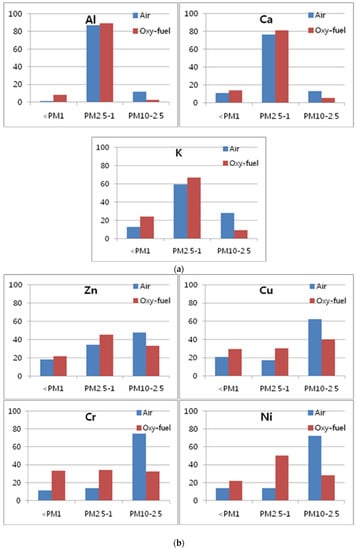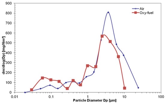 As sewage sludge combustion generates a large amount of fly ash, an understanding of particle size distribution of fly ash is important because it mainly consists of alkali and heavy metals. It was hypothesized that particle size distribution would be affected by different surroundings during air and oxy-fuel combustion. Figure 4 shows the particle size distribution in fly ash from air and oxy-fuel combustion of sewage sludge. Particle size distribution from air combustion was mainly accumulated by coarse particles over 2.5 μm in size, whereas from oxy-fuel combustion, it showed each accumulation mode in fine particles below 1 μm in size, super-micron particles ranging in size from 1 μm to 2.5 μm, and coarse particles over 2.5 μm in size. Generally, fine particle formation was followed by a series of reactions of metal elements, such as nucleation, condensation, and coagulation. The sub-micron mode was depicted by each formation process, including direct vaporization of volatile metals and chemical reactions of refractory metal oxides. Refractory metal oxides (MOX), in particular, could be reduced to sub-oxides (MOX−1) by the reaction shown in Equation (1).
