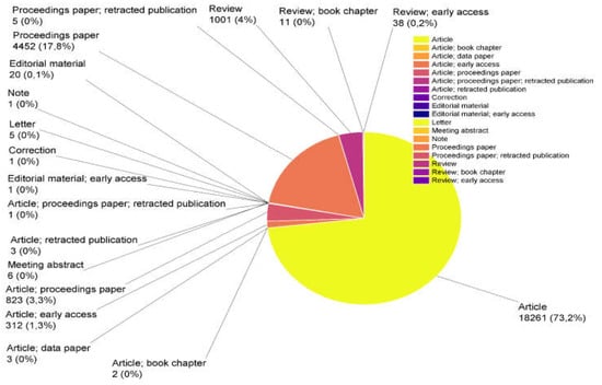 Articles with a weight of 73.2 percent (18,261 documents) of the categories of documents released take precedence here, followed by proceedings paper (17.8%—4452 documents) and review (4 percent—1001 documents) and other categories (Figure 1).