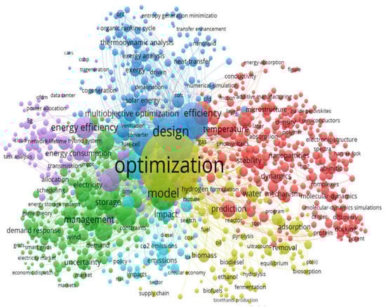 Co-occurrence analysis of keywords can highlight the link between study subjects and identify more comprehensive and relevant research trends. Furthermore, this technique may recognize common links between specific terms, explore new terminology that have received little attention, and disclose current and upcoming themes in energy optimization research. In this study, 78,086 keywords were identified, including author keywords and keywords derived from the title and abstract, from 24,946 documents. The co-occurrence network knowledge mapping was shown; word repetition was restricted to three times. A list of keywords of higher research value were further selected, resulting in a co-occurrence network view of the top 5884 keywords, as shown in Figure 2.