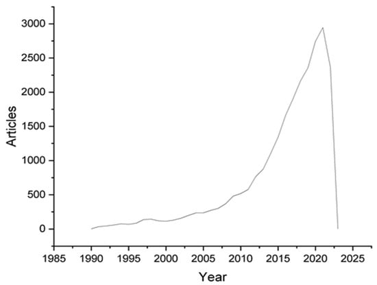 According to the article’s growth tendency, the entire era was separated into two major stages: the emerging stage (1990–2014) and the affluence stage (2014–2021). The number of published publications was quite low in the early stages, less than 50 per year; similarly, the yearly growth rate was slight. Following that, energy optimization had a burst, with the number of publications jumping from 1100 in 2014 to 2365 in 2022.