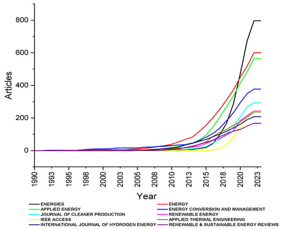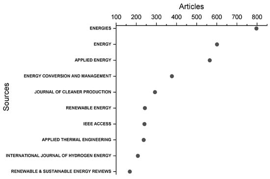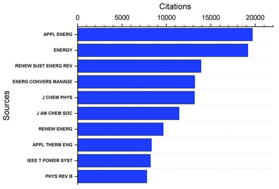 With a significant expression in the last 5 years, these journals with the largest number of documents published have been seeing a steady growth in their number of local citations, with special significance to Applied Energy, with a number of local citations 19,685; followed by Energy, with a number of local citations 19,170; followed by Renewable and Sustainable Energy Reviews, with 13,887 citations; and Energy Conversion and Management, with 13,183 local citations, as shown in Figure 6.