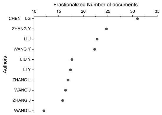 The total output was produced by 70,098 authors, with 911 authors of single-authored documents. Thus, the number of authors per publication on average is 0.35, and the average co-authors per paper is 4.31, with a collaboration index equal to 26.59%. Cheng L.G. from China topped the list with 31 Fractionalized Documents (FD), followed by Zhang Y. with 24.7 FD, Li J. with 22.8 FD, Wang Y. with 22.3 FD, Liu Y. with 17.7 FD, Li Y. with 17.4 FD, Zhang L. with 16.9 FD, Wang J. with 16.4 FD, Zhang J. with 15.8 FD, and Wang L. with 12 FD; these are among the key researchers (Figure 8). As previously said, energy optimization is viewed as an essential driver in the promotion and development of working processes, and a significant number of academics have been paying close attention to the subject in recent years.