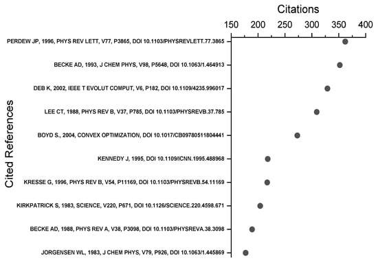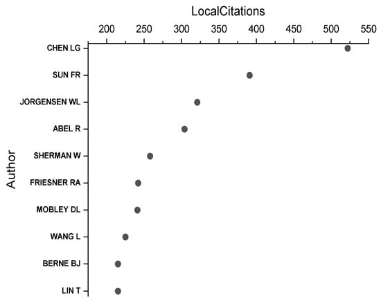 Highly cited authors who were cited more than 215 times have been depicted in Figure 9; the most highly cited author who received more than 522 citations originated from China. As shown, Chen L.G. is the most frequently referenced author (660 citations), followed by Sun F.R. with 391, Jorgensen W.L. (321), Abel R. (304), Sherman W. (258), Friesner R.A. (242), Mobley D.L. (241), Wang L. (225), Berne B.J. (215), and Lin T. (215). So, the number of received citations is impacted by the citation window, or the time period for which citations were computed, cumulative citations per year were used to regulate the fluctuation in citations.