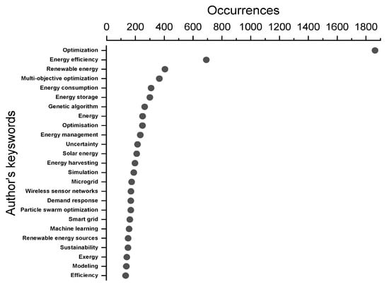 Figure 11 illustrates the most prominent author keywords. The majority of the keywords are linked to optimization (1862), energy efficiency (692), and renewable energy (405). Author keywords demonstrated comparable research tendencies overall; the keywords highlighted the concentration of energy-related studies. As shown, author keywords focused energy sources, methods, and techniques, such as “renewable energy”, “solar energy”, “particle swarm optimization”, “machine learning”, etc.