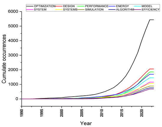 Another intriguing factor to explore is the annual increase in the top ten keywords. Overall, every keyword climbed year after year, demonstrating the continued and steady expansion of energy optimization, the trend of which from 2014 to 2023 is clearly depicted in Figure 12. The facts show that “Optimization” has maintained the most common occurrence during the last decade. Since 2015, the second most common occurrence has been “Design”, with a substantial increase in the curve. “Performance” has gone up significantly since 2017, and it will be the third most popular term in 2023. Although “Design” has shown a considerable growth since 2014, it is expected to keep growing in the future.