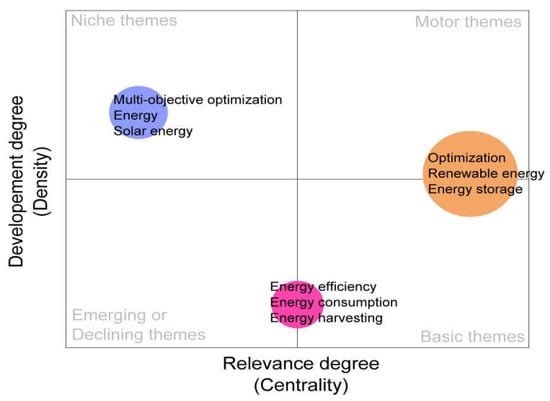 The niche themes quadrant in the upper-left quarter contains clusters that are well developed but not critical to the field. Cluster 1 comprises “multi-objective optimization”, “energy”, and “solar energy” from this quadrant.