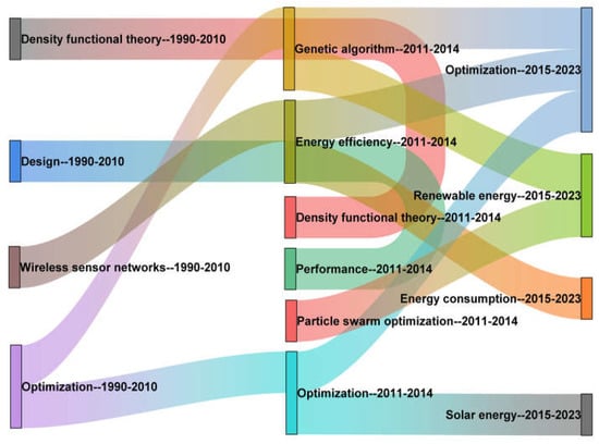 Figure 14 shows a Sankey diagram created to evaluate the theme progression. A Sankey diagram is used to showcase how several topics are related and have progressed earlier. Each box on the map represents the size of the boxes and the theme is proportionate to the frequency with which the topic occurs. The flows link each box, displaying the theme’s evolution traces; the greater connection between the two subjects, the thicker the connecting line. Analysts can easily determine the most prominent contributions, since each flow has a varying height depending on its quantity. Overall, it can be seen that as time passes, optimization subjects become increasingly widespread, most likely due to the rising attraction of scientists from many professions.