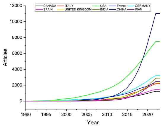 China published the most articles (11,031 documents), followed by the United States of America with 7506 documents, Germany (3212), and India (2887), which contributed far fewer papers, as compared to the USA and China. Thus, these two countries together produced about 74 per cent of the total output. Canada, United Kingdom, Italy, France, and Spain were among the other countries of origin (Figure 15).