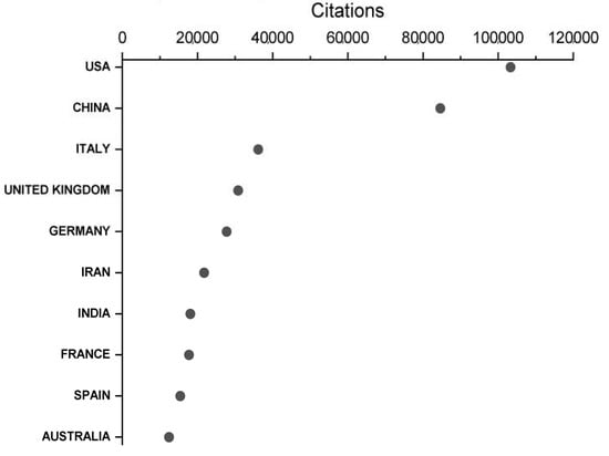The output pattern indicates a highly skewed distribution of research production, since the output of the other countries not represented in Figure 16 ranged from 1 to 100 publications in total. The most mentioned nations are the United States (103,310 citations), China (84,614), Italy (36,155), United Kingdom (30,830), and Germany (27,748). Iran (21,748), India (18,087), France (17,728), Spain (15,410), and Australia (12,430) were among the other nations represented (Figure 16).