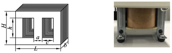 In this study, the specified capacity of the transformers used was a single-phase 500 VA, and the nominal voltages of the low-voltage and high-voltage sides were 110 and 220 V, respectively, with a rated frequency of 60 Hz. As shown in Figure 1, the iron core was shell-type and made of lamination steel. The dimensions of the iron core are listed in Table 1. The length of the equivalent magnetic path () and the equivalent cross-sectional area () were calculated using Equations (1) and (2) [12]. After the core size was recorded (Table 1).