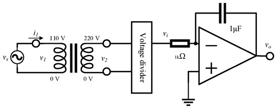 As shown in Figure 2, a common inverting integrator circuit was used to integrate the voltage on the secondary side of the voltmeter. A voltage divider attenuated the input signal to match the input range of the inverting integrator, that is, the voltage range of the working power supply. The input voltage of the integrator was fixed to allow the amplifier to operate in the linear region.